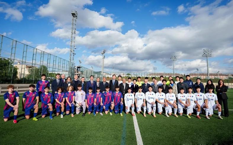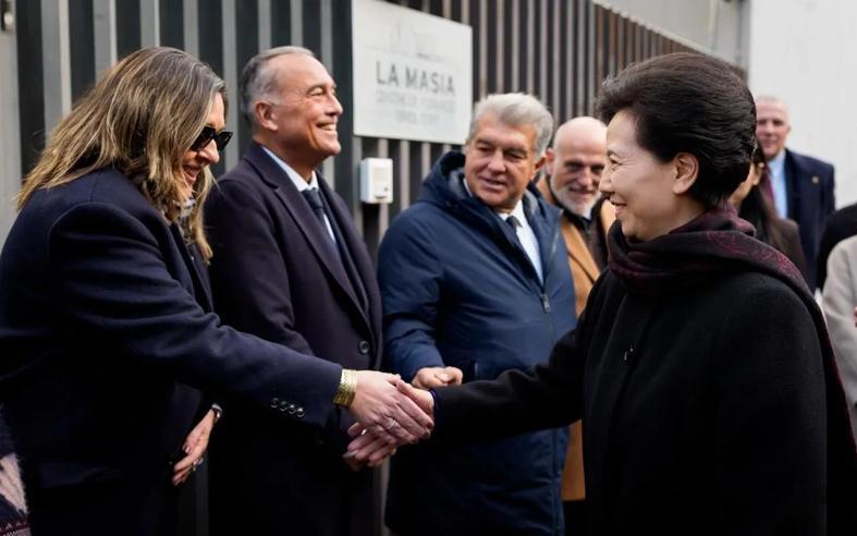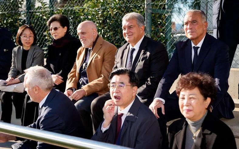 巴塞罗那俱乐部主席拉波尔塔与西甲联盟主席特巴斯,共同欢迎由中国国务委员谌贻琴率领的中国代表团访问巴萨拉玛西亚青训营。